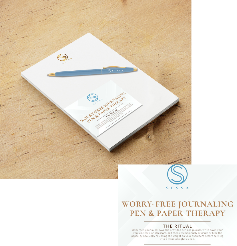 Unburden your mind. Take the provided pen and journal, write down your worries, fears, or stressors, and then ceremoniously crumple or tear the paper, symbolically releasing the weight on your shoulders before settling into a tranquil night's sleep.