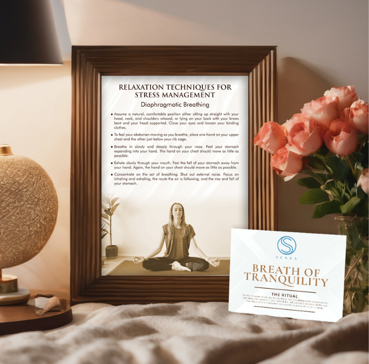 Settle into your sanctuary, follow the guided breathing exercises provided, and allow the rhythmic flow of breath to melt away the stresses of the day creating a serene atmosphere conducive to a peaceful night's sleep with a lit scented candle.