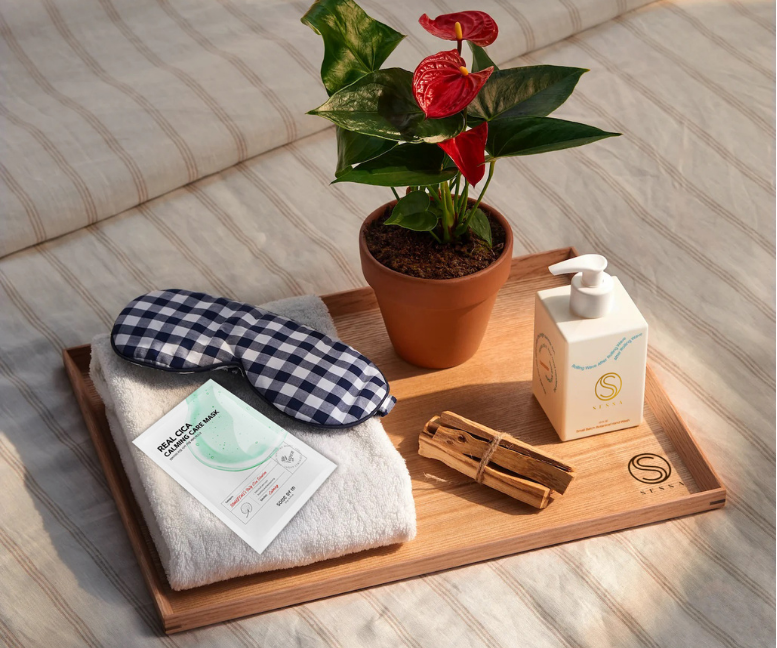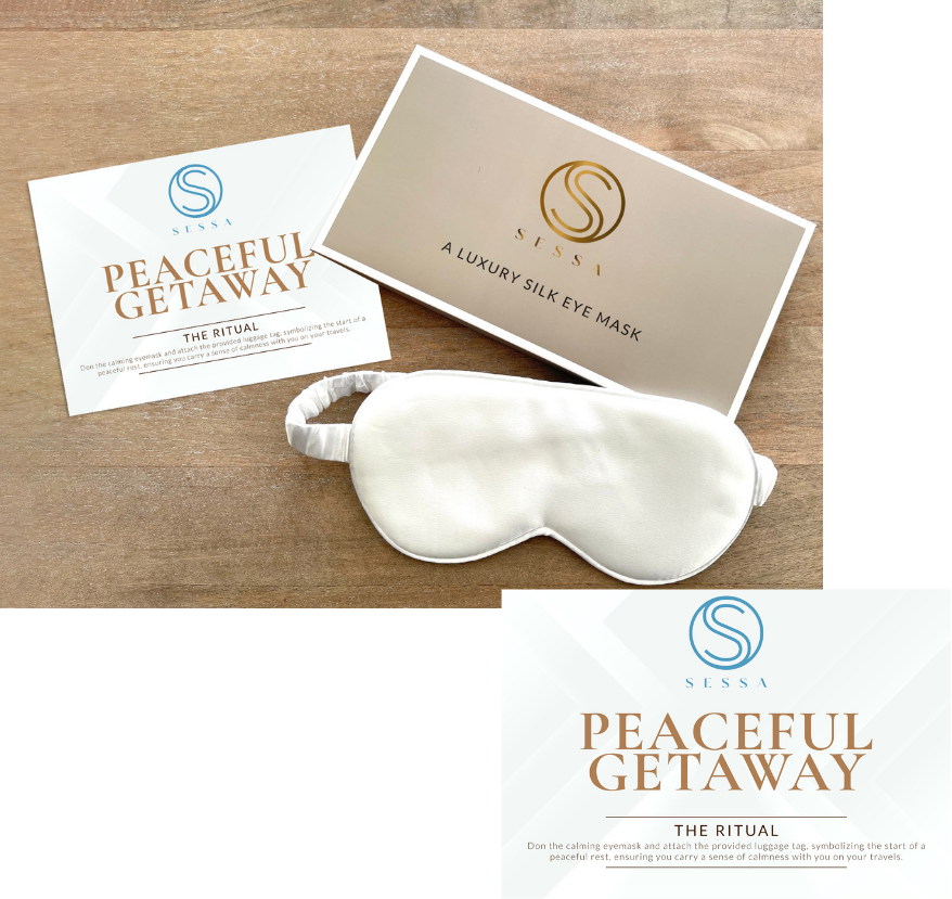 Don the calming silk eyemask, symbolizing the start of a peaceful rest, ensuring you carry a sense of calmness with you on your travels.