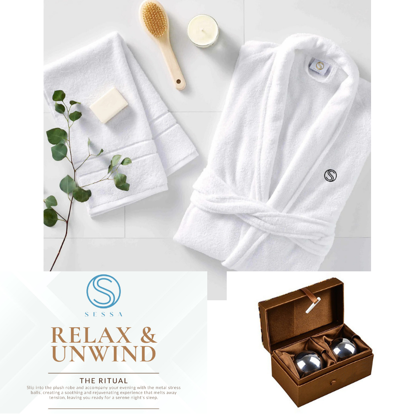 Slip into the plush robe and accompany your evening with the metal stress balls, creating a soothing and rejuvenating experience that melts away tension, leaving you ready for a serene night's sleep.