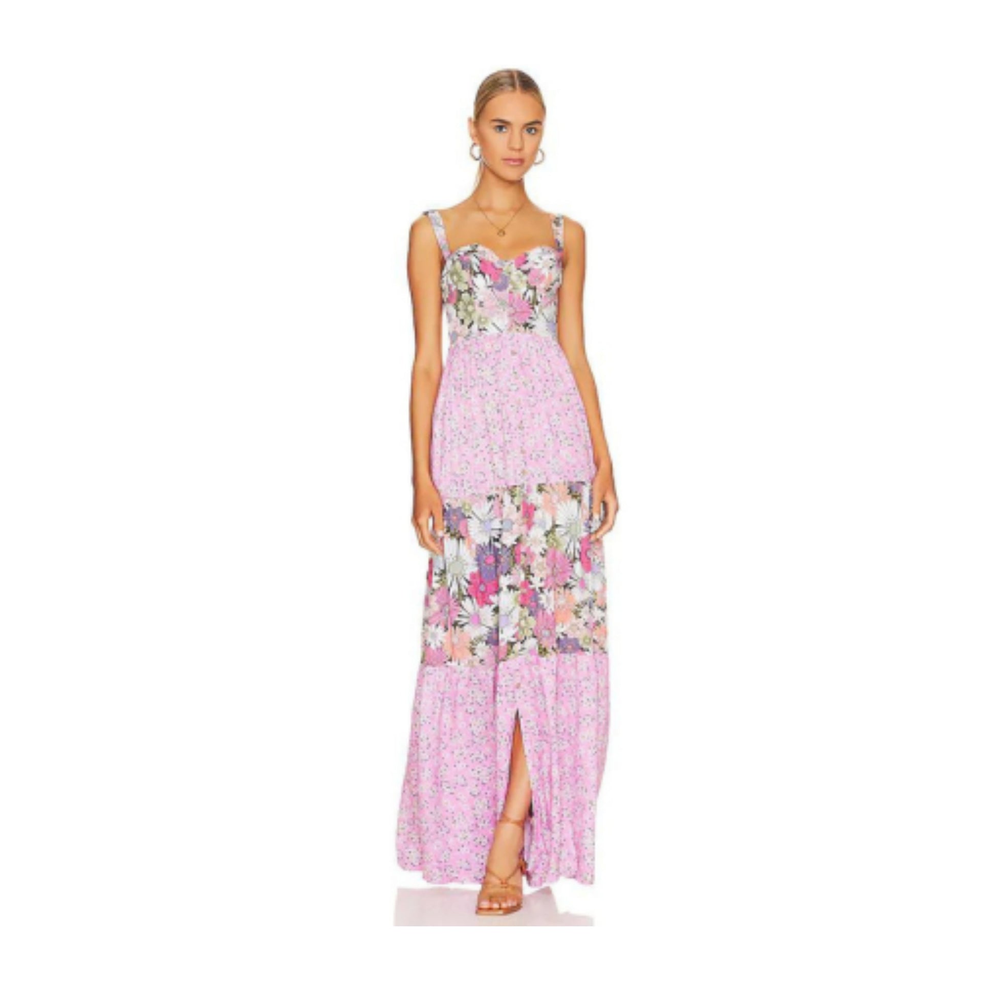 Embrace effortless elegance in the Alani Maxi Dress, a stunning tiered floral dress designed for warm-weather charm. Featuring a bustier-style bodice with structured cups and delicate straps, this flowy maxi dress flatters your figure while offering all-day comfort. The mixed floral print and soft pastel tones add a romantic touch, while the front slit ensures graceful movement. Perfect for vacations, brunches, garden parties, or summer strolls, the Alani Maxi Dress is a must-have for any feminine wardrobe.