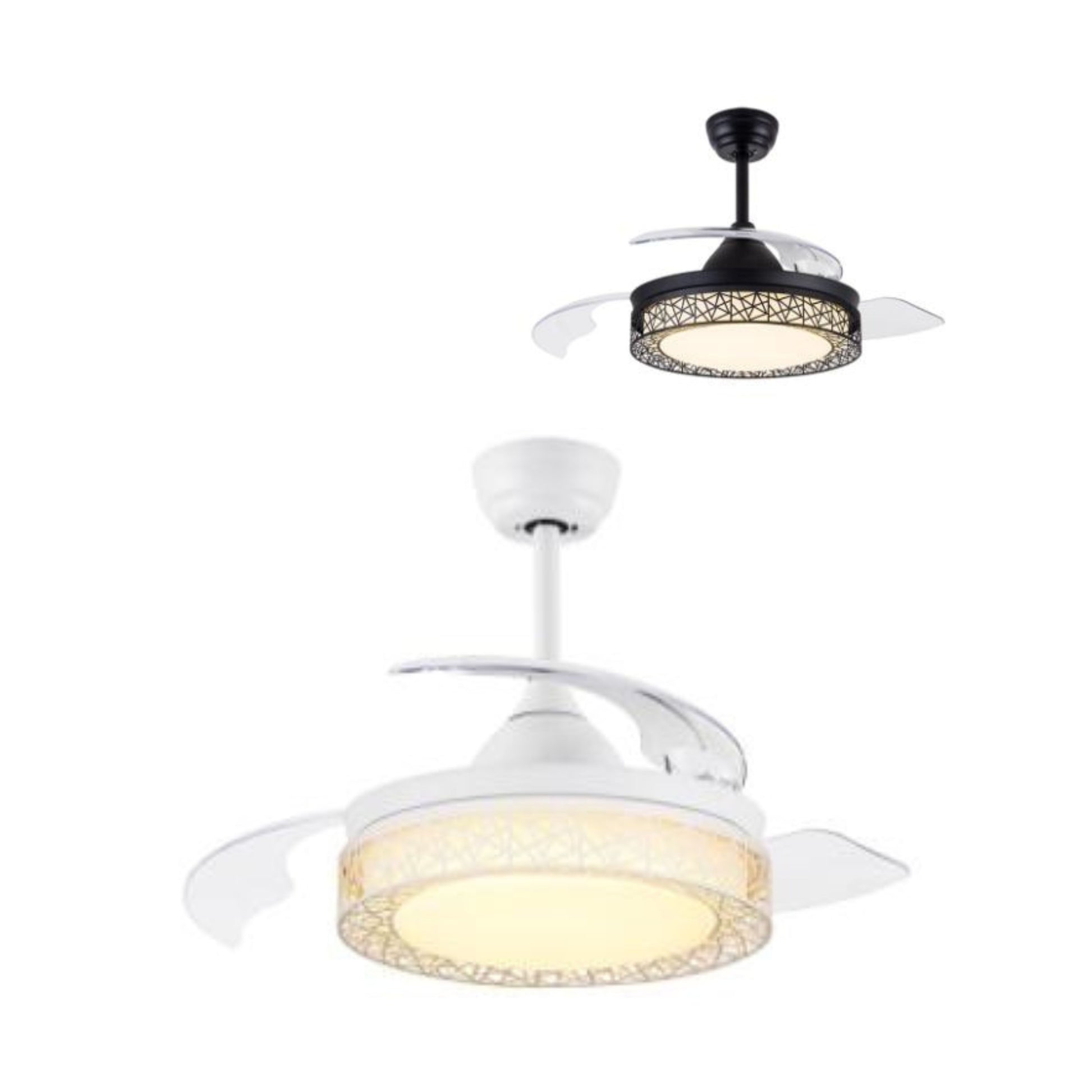 The Model 0091 is a 42-inch ceiling fan designed for indoor use. It features an integrated 48W LED light source, providing efficient illumination. The fixture offers dual color temperatures of 3000K (warm white) and 6000K (cool white), allowing users to adjust the lighting to their preference. The design is available in black and white finishes, complemented by durable ABS blades.