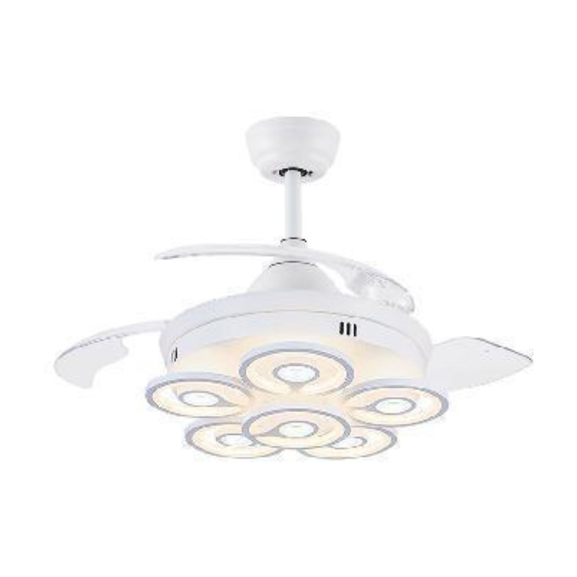 The Model 1237D ceiling fan features a 42-inch design, perfect for medium-sized rooms. It is equipped with a 54W integrated LED module, providing bright and energy-efficient lighting in dual color temperatures of 3000K (warm white) and 6000K (cool white). Finished in a sleek white, this fan is built with durable ABS blades for both style and long-lasting durability.