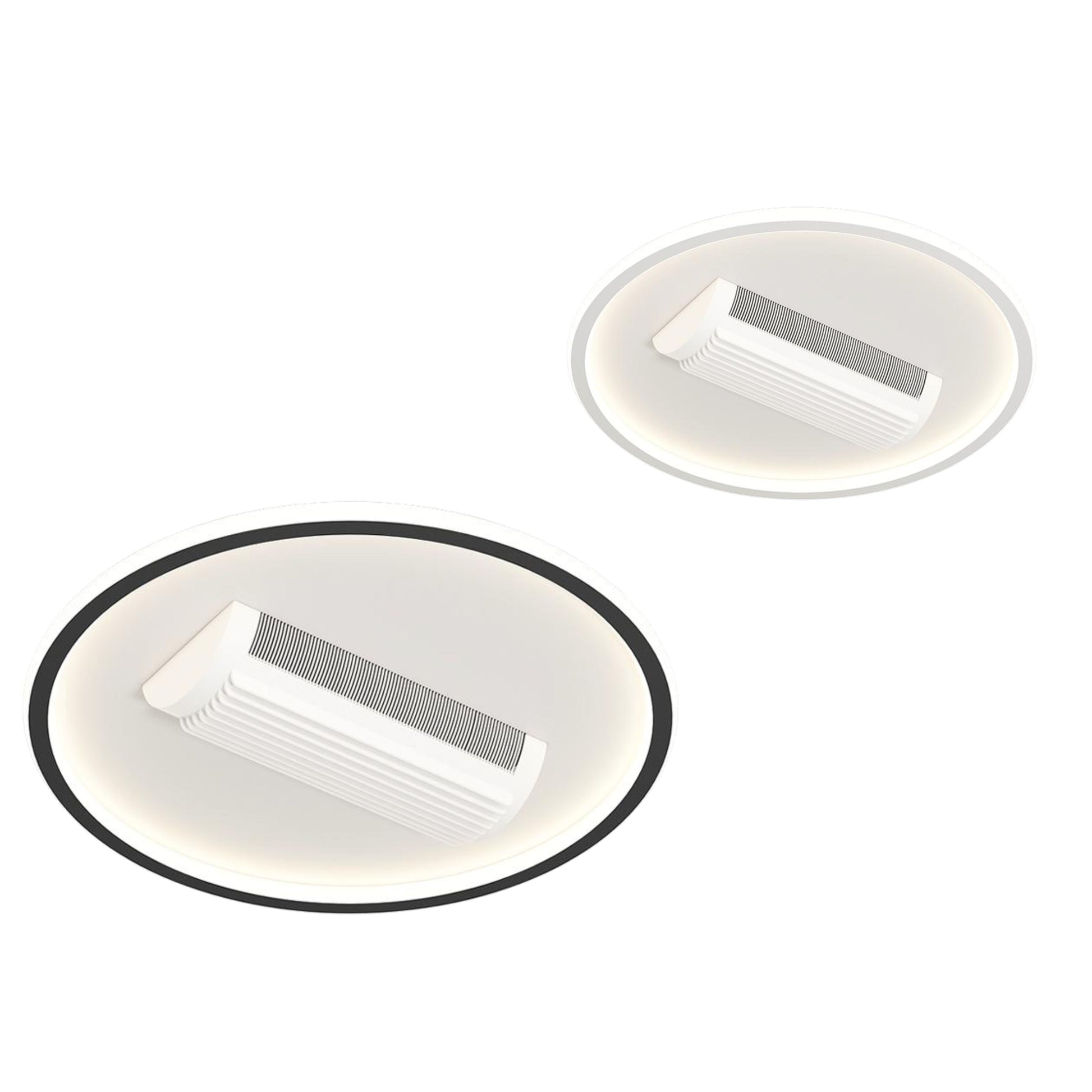 The Model 1631A is a modern bladeless ceiling fan designed for compact spaces. Measuring 500mm x 100mm, it features a sleek black and white finish that complements contemporary interiors. Equipped with a 50W LED light source, this fan offers dual color temperatures of 3000K (warm white) and 6000K (cool white), allowing users to adjust the lighting to their preference. The bladeless design ensures safety and quiet operation, making it suitable for bedrooms, small living areas, and offices.