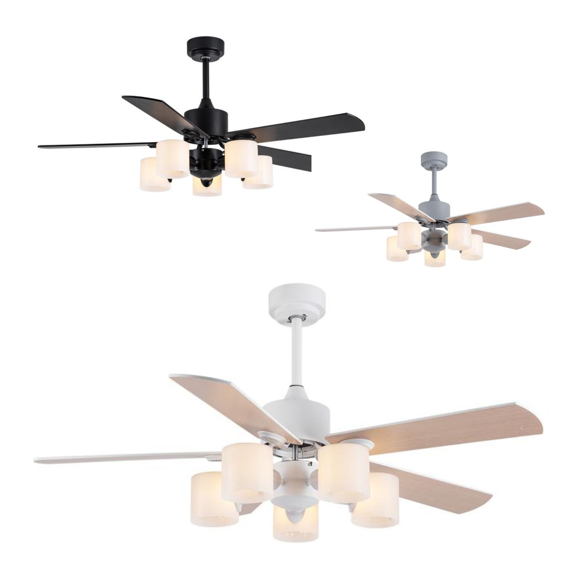 The Model 5325A ceiling fan is designed for indoor use, featuring a size of 52 inches suitable for various room sizes. It offers a modern aesthetic with color options including original+white, black, and original+grey finishes, complemented by durable wood blades. This model does not include a built-in light source, providing a streamlined design for spaces where additional lighting is not required.