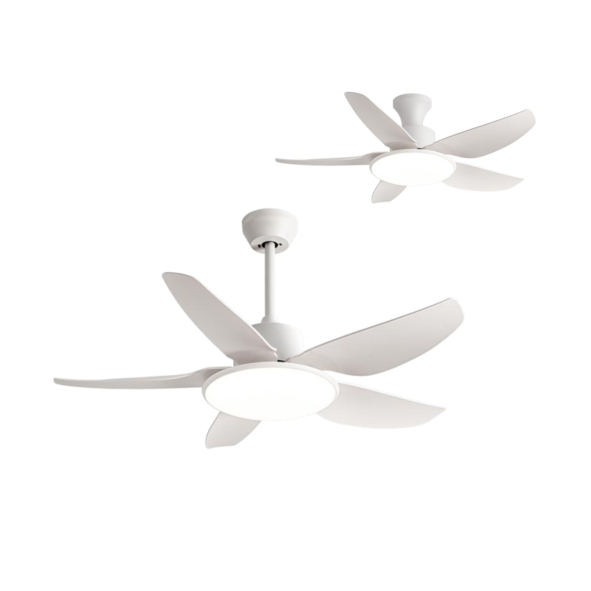 The Model 673 ceiling fan is designed for indoor use, featuring a size of 45 inches suitable for various room sizes. It offers a modern aesthetic with a white finish, complemented by durable ABS blades. Equipped with a 36W LED light source, it provides dual color temperatures of 3000K (warm white) and 6000K (cool white), allowing users to adjust the lighting to their preference.
