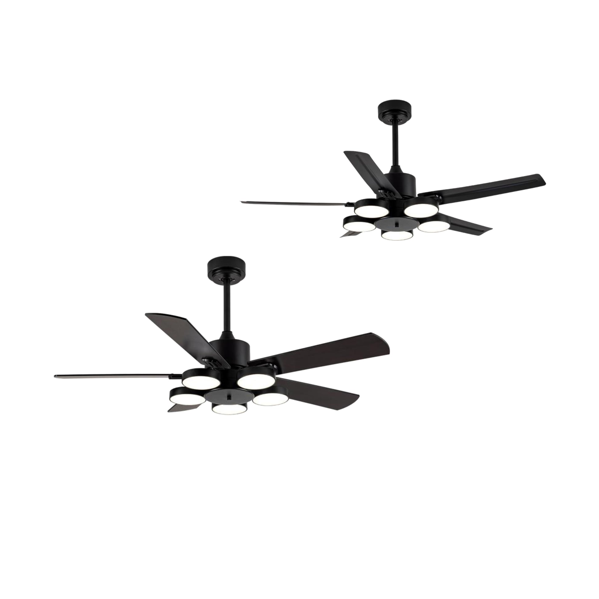 The Model 706A ceiling fan features a 52-inch design, making it perfect for larger rooms or open spaces. With a powerful 60W integrated LED module, it delivers bright, energy-efficient lighting in two color temperatures: 3000K (warm white) and 6000K (cool white). Finished in sleek black with a combination of wood and steel elements, this fan provides a modern industrial aesthetic with durability and performance.