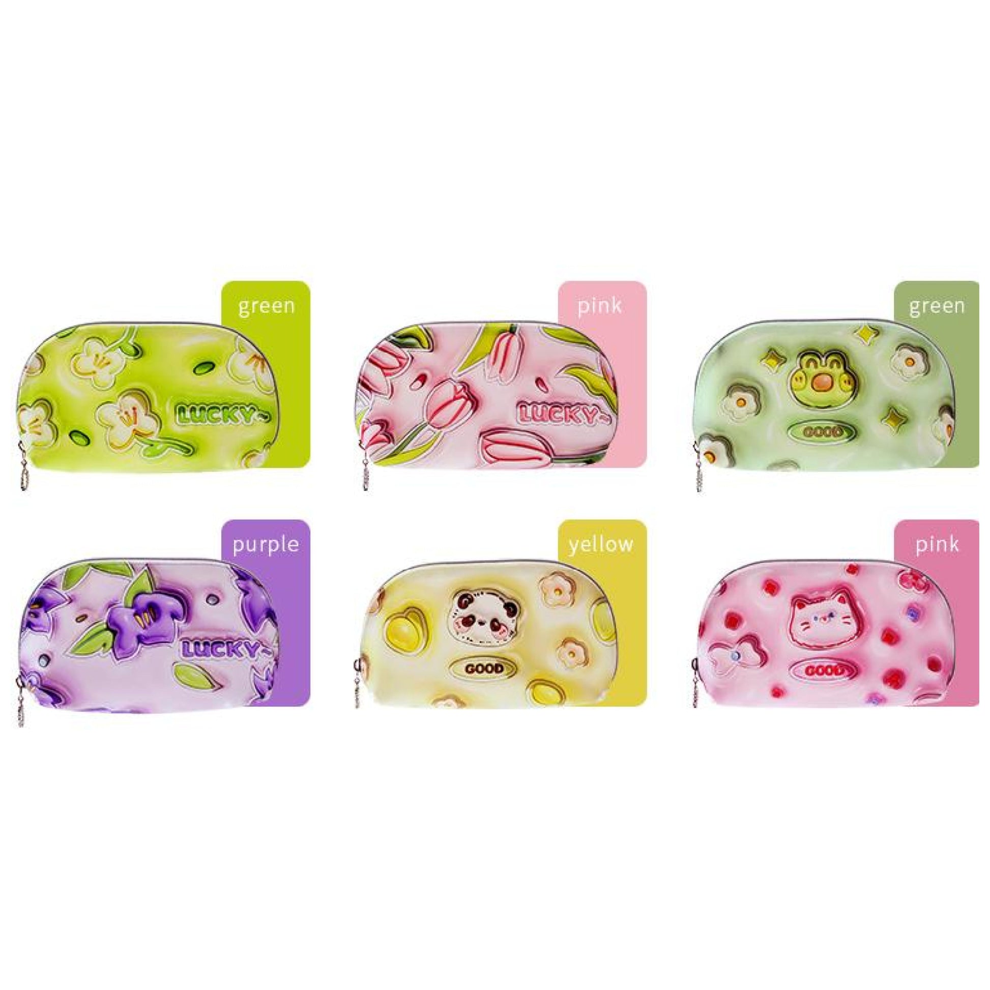 The RH2329 and RH2330 cosmetic bags feature a playful inflated-style design with a 3D semi-circle shape, crafted from waterproof and flexible TPU material. Lightweight and stylish, RH2329 (small) weighs 64g and measures 18x7x11cm, while RH2330 (large) weighs 69g and measures 20x6x12cm. These pouches are perfect for storing makeup, skincare products, or small travel essentials. Available in a fun range of colors—Green Clover, Pink Lily, Green Frog, Purple, Yellow, and Pink Cat—they offer a modern, whimsical twist on everyday storage.