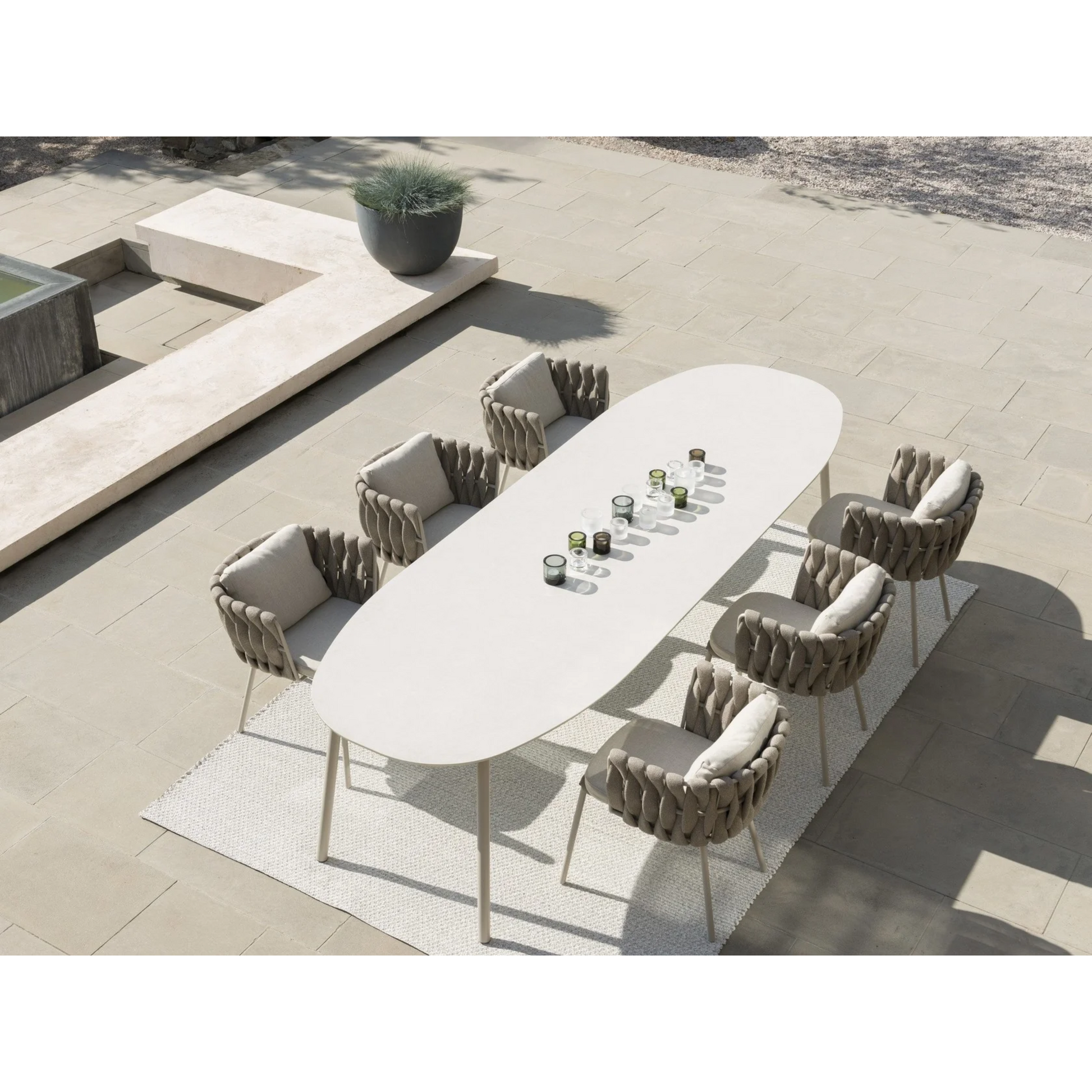 Transform your outdoor space with this modern and stylish dining and patio set, designed for durability and comfort. The sleek table combines the warmth of wood with the strength of aluminum, while the chairs feature a lightweight aluminum frame with woven rope for a contemporary touch. Available in three configurations—4+1 dining set, 6+1 dining set, and 2+1 patio set—this versatile collection is perfect for both intimate patio lounging and larger outdoor gatherings. Built to withstand various weather conditions, this set is an ideal addition to any garden, terrace, or balcony.