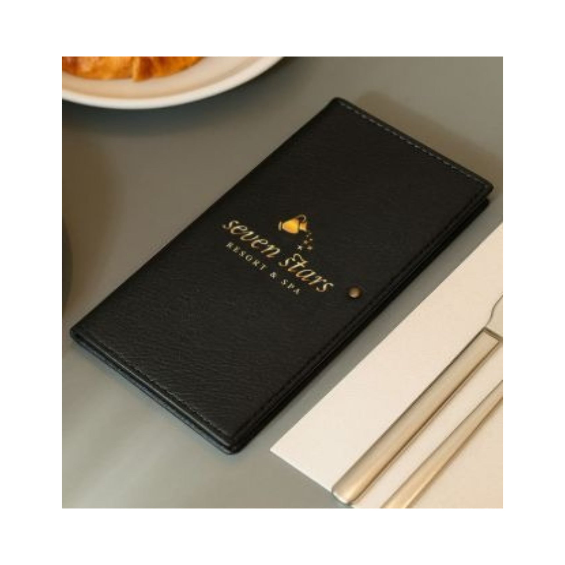 The Elegant PU Leather Menu Cover offers a sleek, professional look combined with durable synthetic leather material. Perfect for upscale restaurants and bars, this menu cover features a customizable logo area to showcase your brand with style and sophistication.