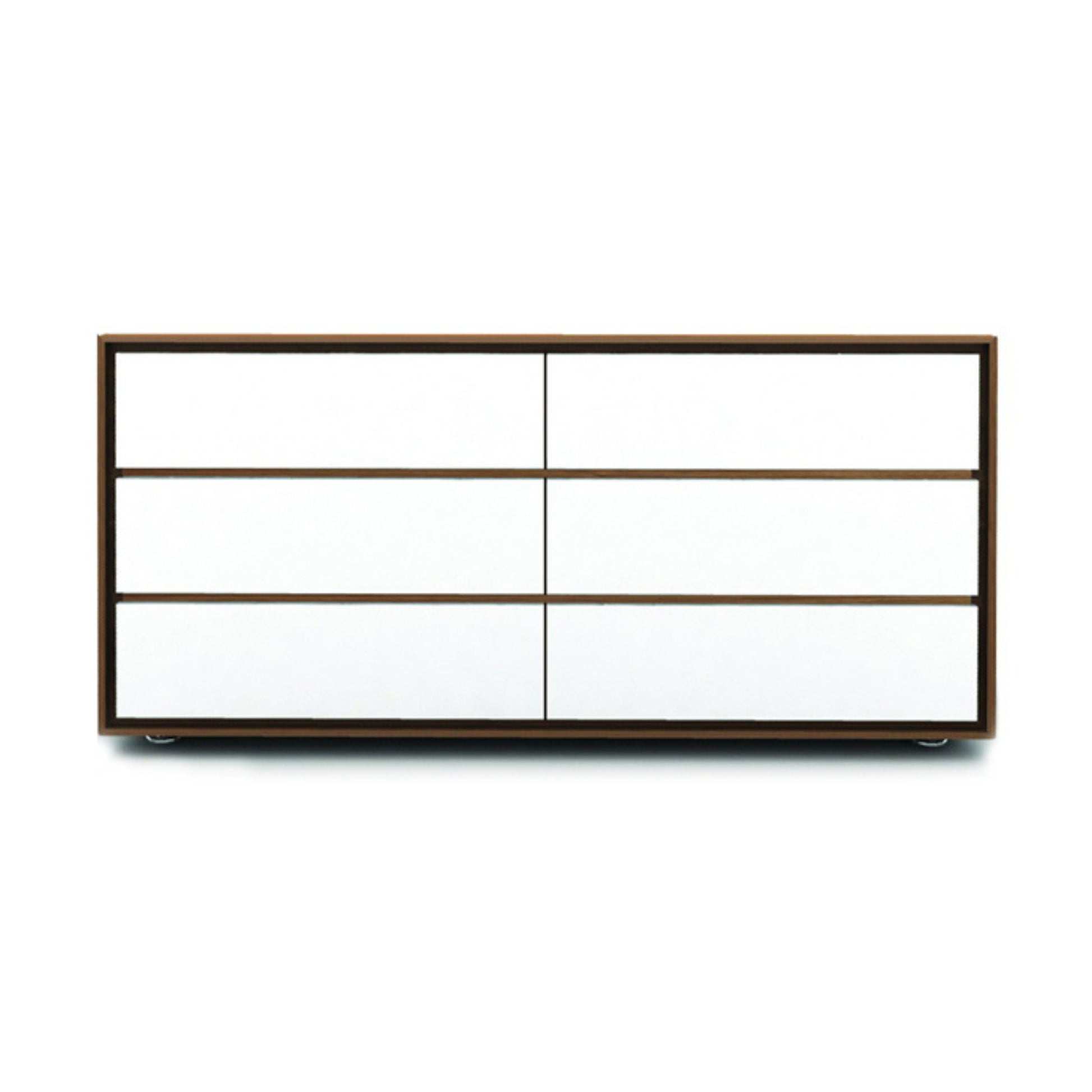 This minimalist double dresser offers ample storage with a clean, modern silhouette. Finished in veneer, it fits seamlessly into contemporary bedrooms or living spaces, blending function with understated design.