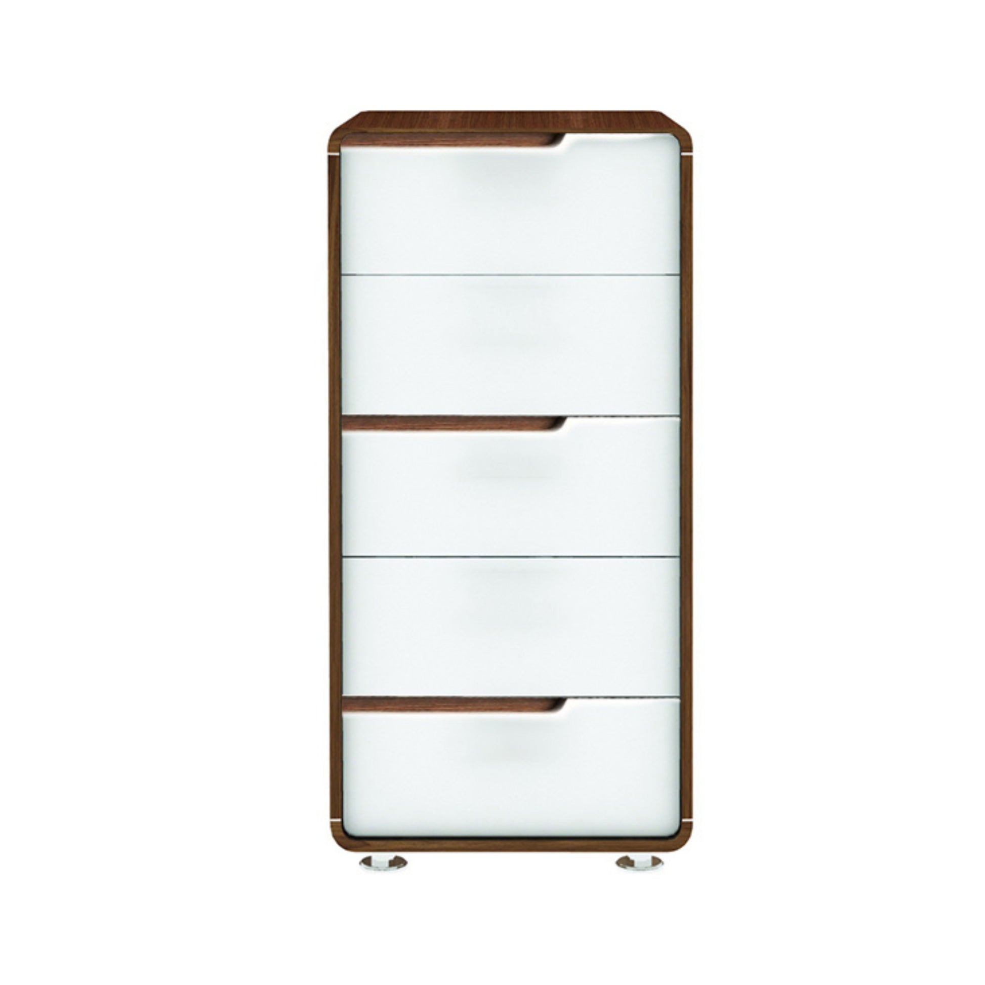 This minimalist high chest features a sleek veneer finish and offers vertical storage ideal for bedrooms or living spaces. Its clean lines and compact footprint make it a versatile addition to modern interiors.