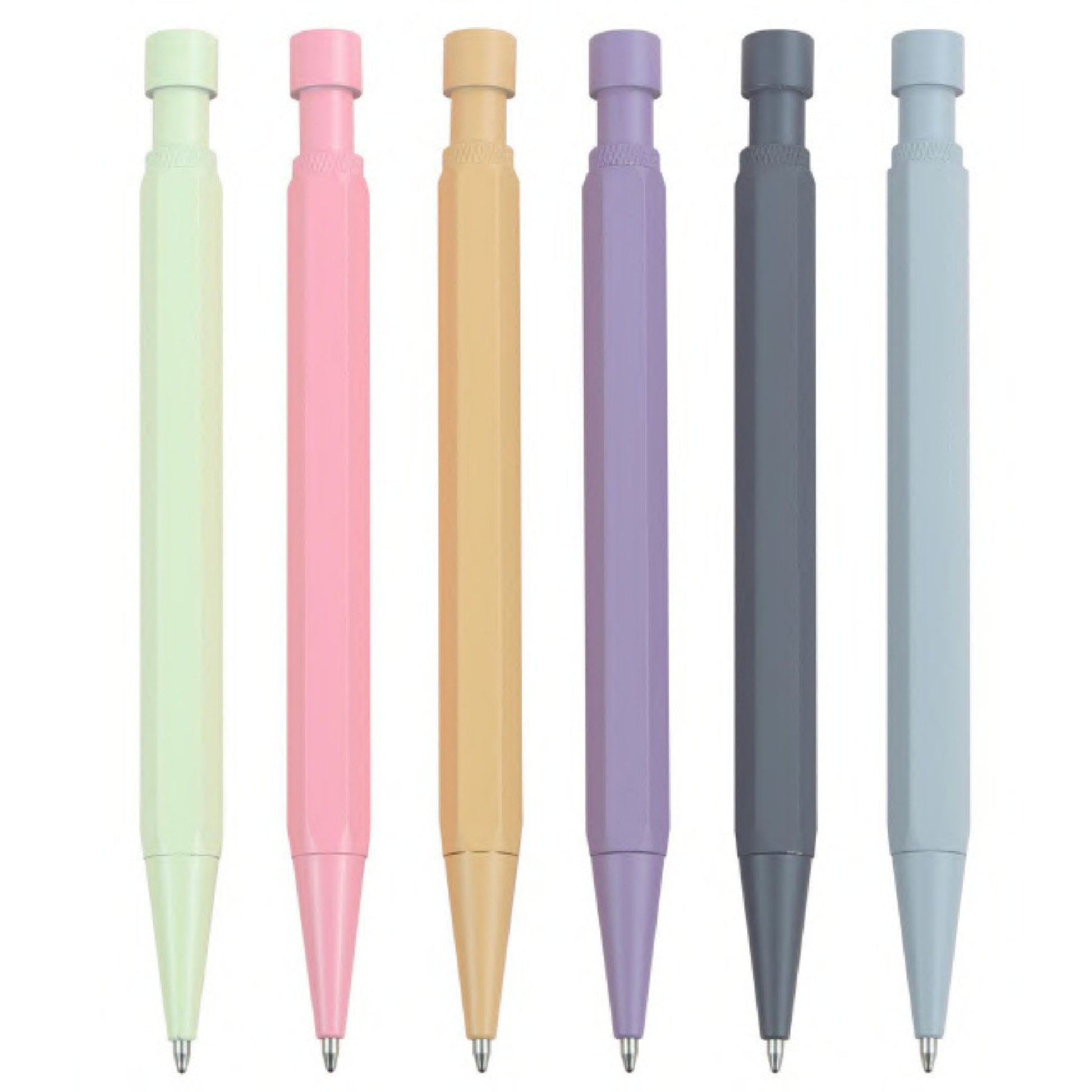 Click action mechanism with hexagon metal barrel, customizable color finish, compatible with laser or pad printing for logo/slogan, standard 1.0mm ballpoint tip, smooth black or blue ink refill, lightweight yet durable metal body.