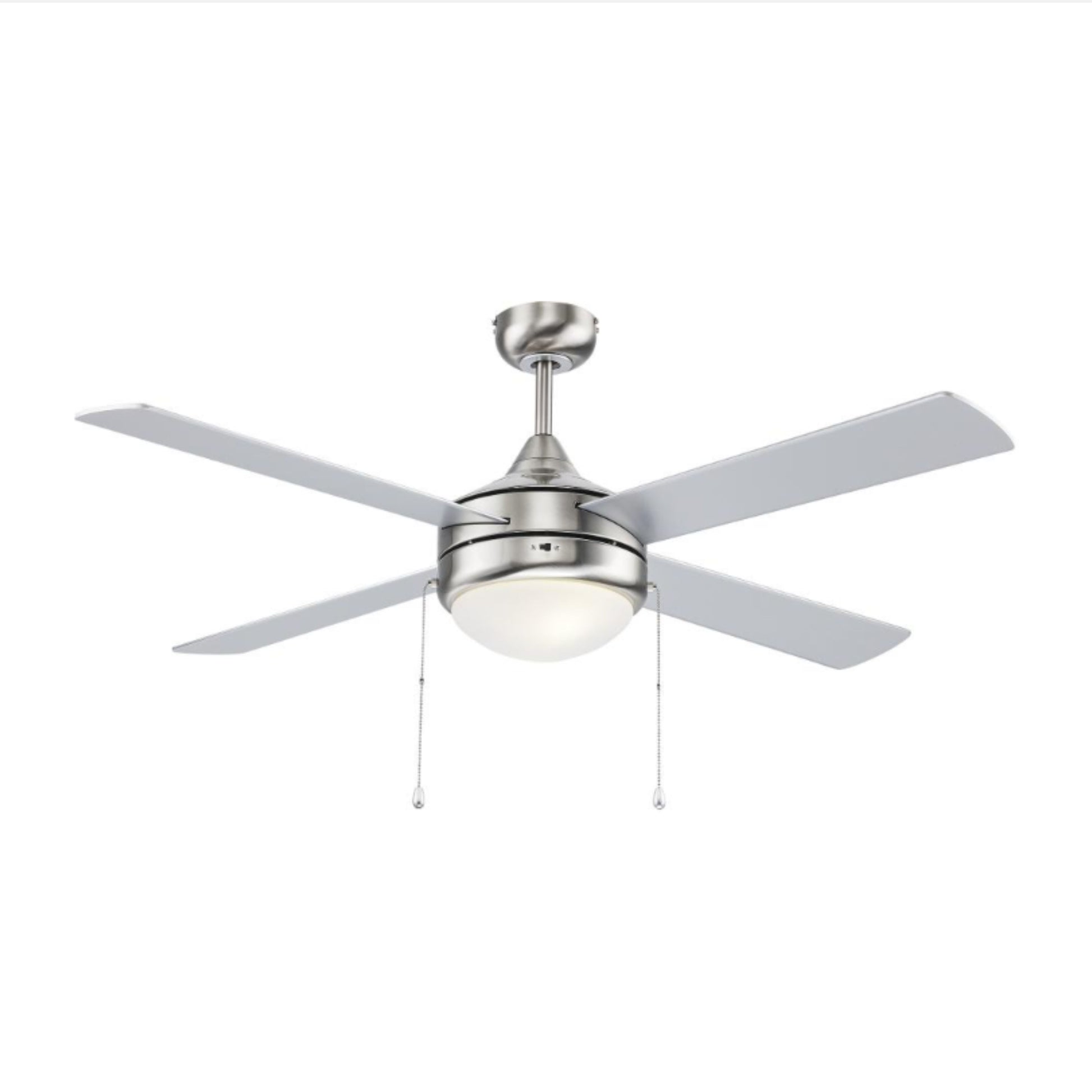 The KBS-52K181 ceiling fan delivers a refined industrial look with its brushed nickel body and sleek silver plywood blades. With a 52-inch span and four sturdy blades, it provides excellent air circulation while enhancing modern interiors. The fan includes a glass lamp shade housing an energy-efficient 18 watt LED light with adjustable color temperature. Powered by a reliable AC motor, it supports forward and reverse airflow. Operation is managed through a classic pull chain switch, combining traditional control with contemporary design.