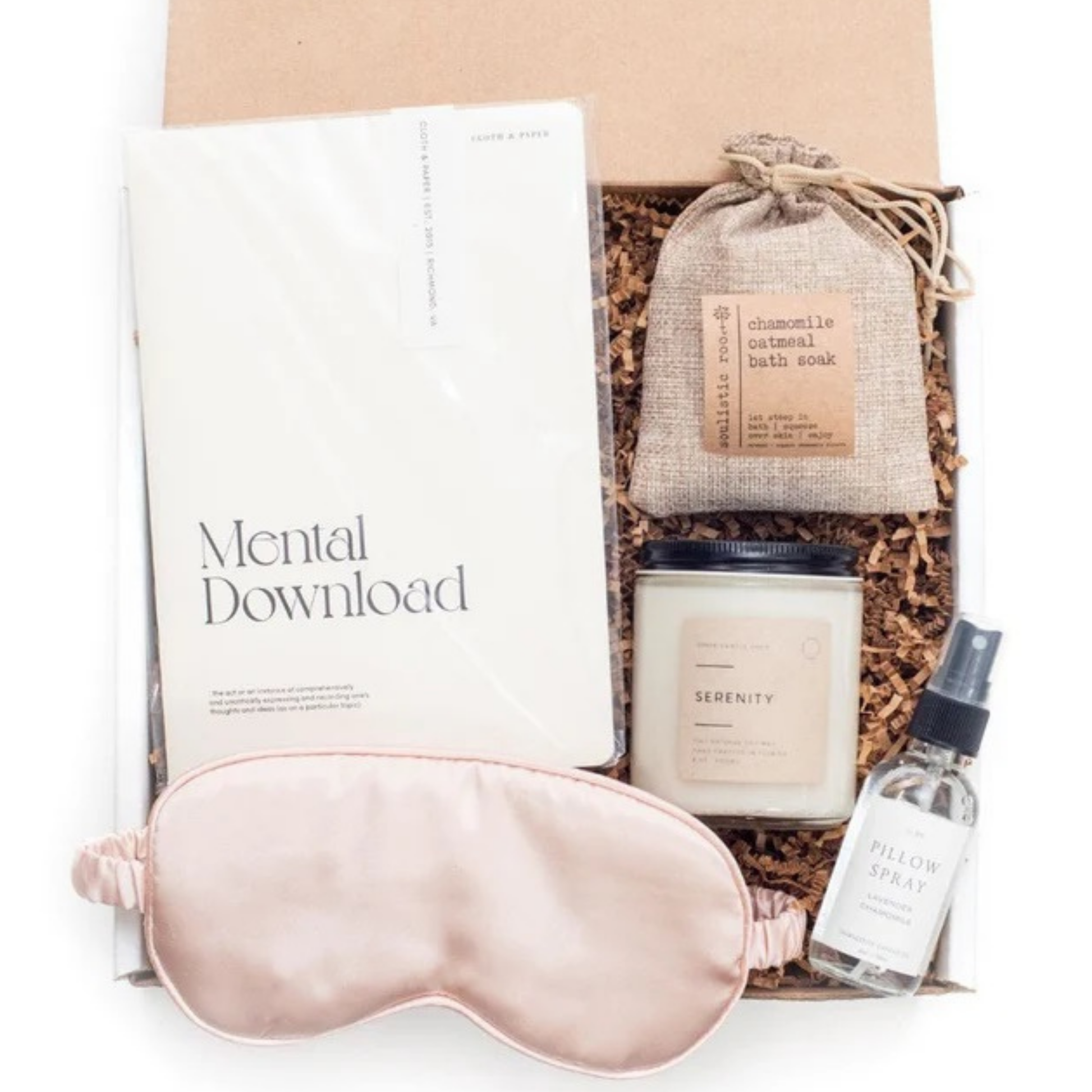 Embrace serenity with the Mellow Mindset Evening Ritual Kit, thoughtfully curated to help you relax and unwind. Soak away the day’s stress with a soothing oatmeal bath, slip into a silky satin sleep mask, and spritz your pillow with a calming mist for a peaceful night’s rest. Light the small batch candle to create a tranquil ambiance, and capture your reflections or intentions in the included journal. This mindful set is perfect for establishing an evening routine that nurtures your body and calms your mind.