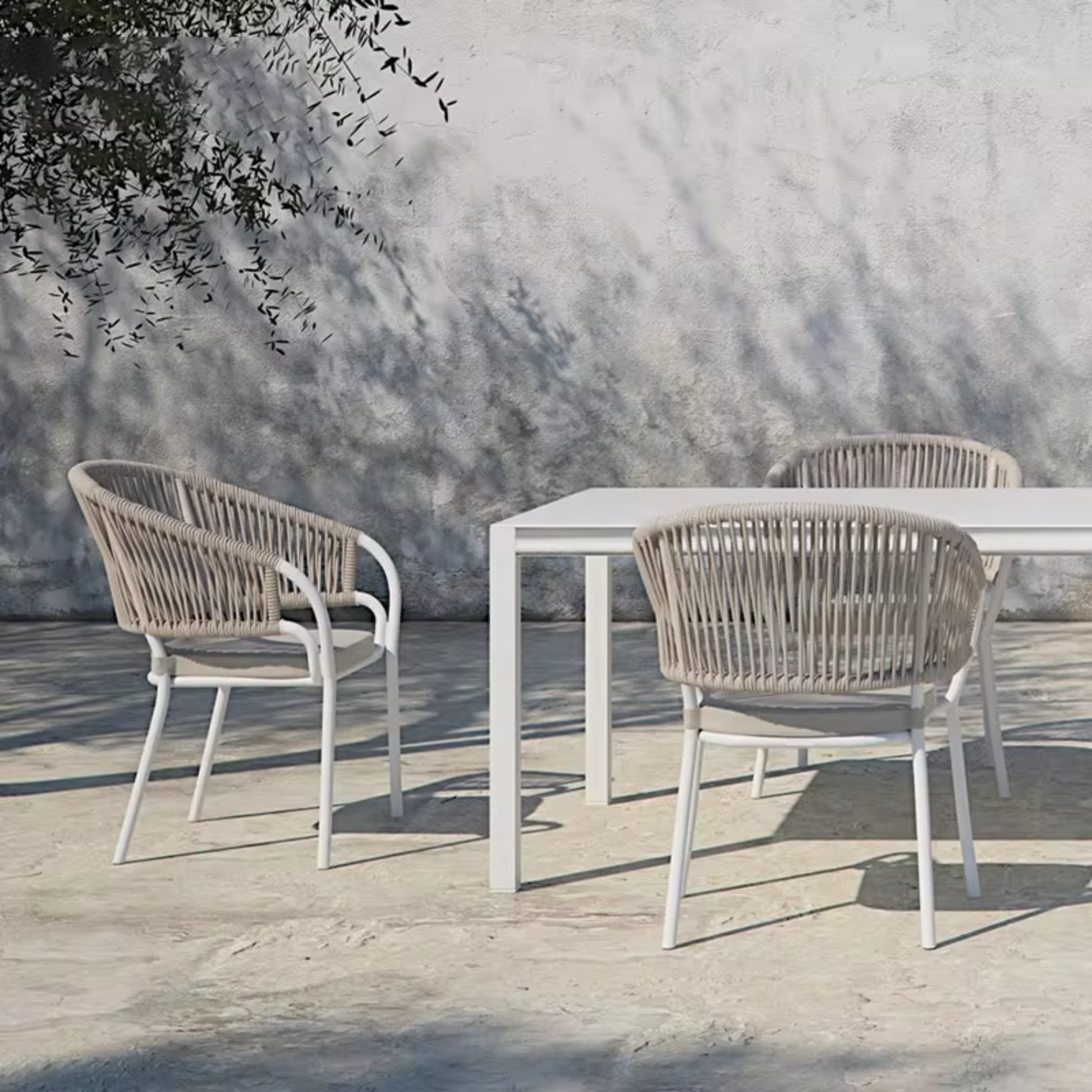 Enhance your outdoor dining experience with this sleek aluminum dining set, designed for both style and durability. The lightweight yet sturdy aluminum table pairs perfectly with aluminum-framed chairs wrapped in elegant rope, offering a modern touch to any patio, garden, or terrace. Available in 4+1, 6+1, and 2+1 configurations, this set provides the perfect balance of comfort and contemporary aesthetics while ensuring weather resistance for long-term use.