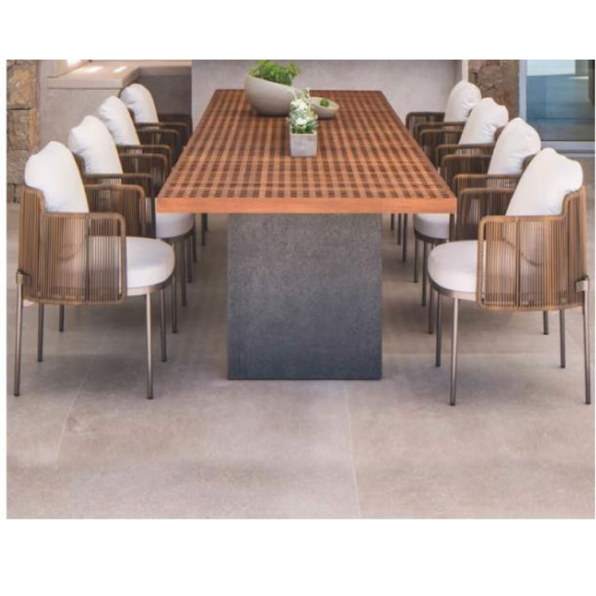 Enhance your outdoor space with this beautifully crafted dining and patio set, designed for both style and durability. The combination of wood and aluminum in the table offers a sleek yet sturdy structure, while the aluminum and rope chairs provide a perfect balance of comfort and modern aesthetics. Available in multiple configurations, including a 4+1 dining set, 6+1 dining set, and 2+1 patio set, this collection is ideal for intimate gatherings or larger outdoor meals. Built to withstand the elements, this set is a timeless addition to any patio, garden, or terrace.