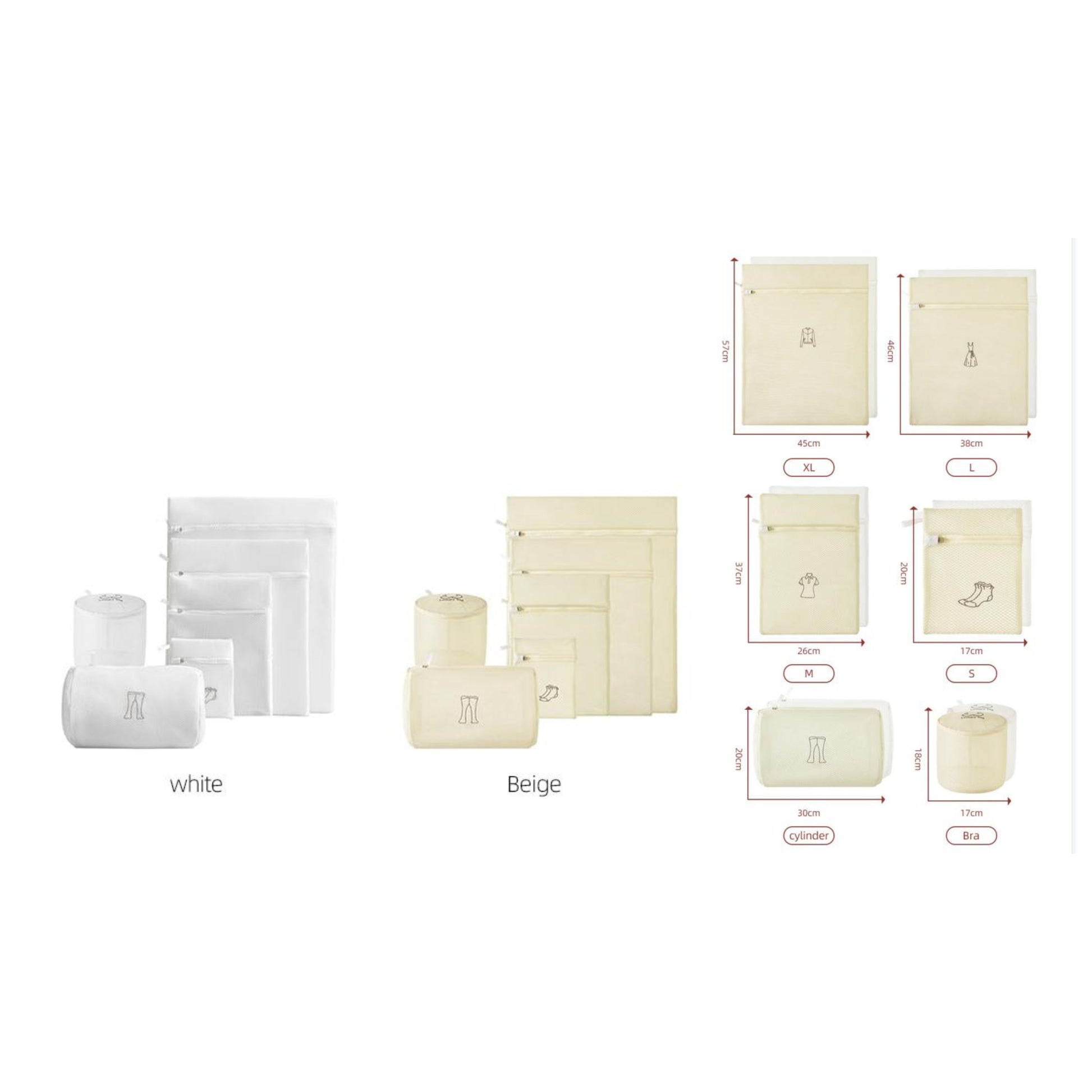 The YTJ005 packing cubes set features six sturdy mesh laundry bags made from 100% polyester mesh with a thicker construction for enhanced durability. Weighing 323g, this set includes XL (45x57cm), Large (38x46cm), Medium (26x37cm), Small (17x20cm), a bra bag (17x18cm), and a cylinder bag (30x20cm). The breathable mesh design ensures proper ventilation and easy sorting of laundry, ideal for travel or home use. Available in White and Beige, this set offers practical organization with a robust build.