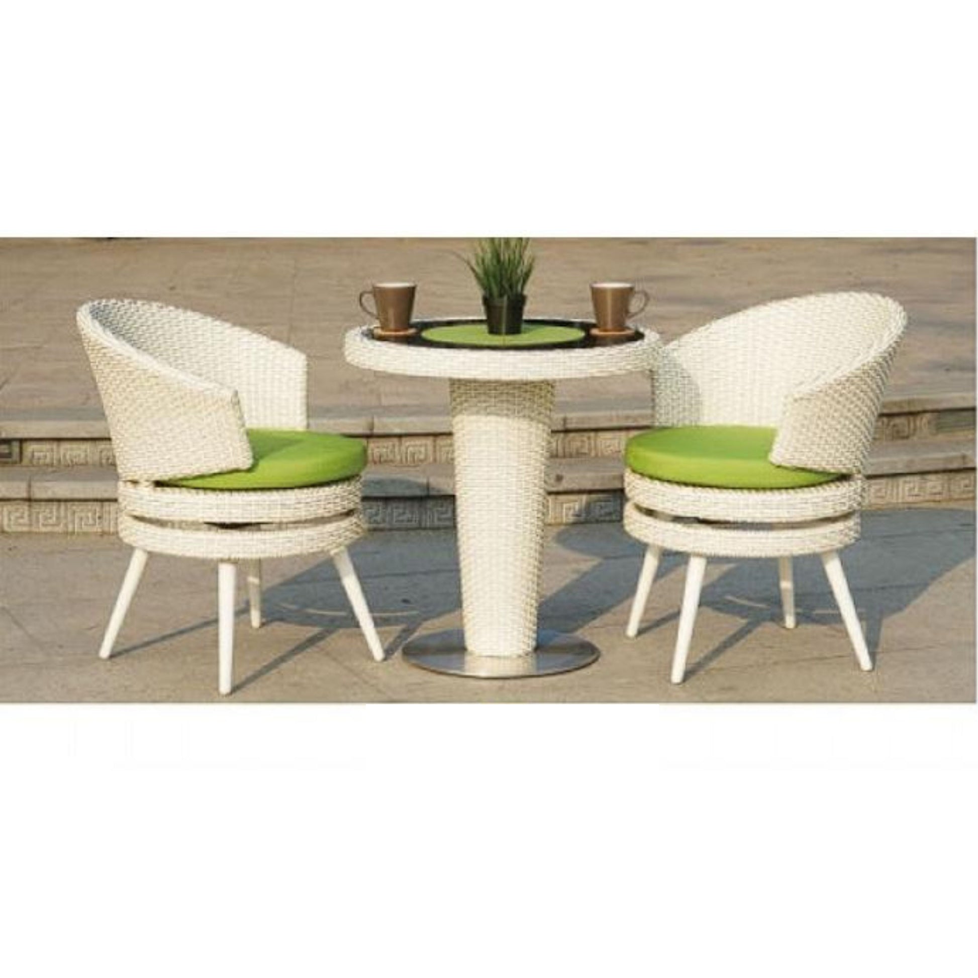Create a sophisticated outdoor seating area with this white wicker patio bistro set, featuring a stylish round table and two elegant swivel chairs. The handcrafted all-weather wicker design is both durable and chic, complemented by vibrant green seat cushions for a pop of color. The compact pedestal table offers a sleek modern look, perfect for casual dining, coffee breaks, or event seating. Ideal for garden parties, patios, poolside lounges, and event spaces.