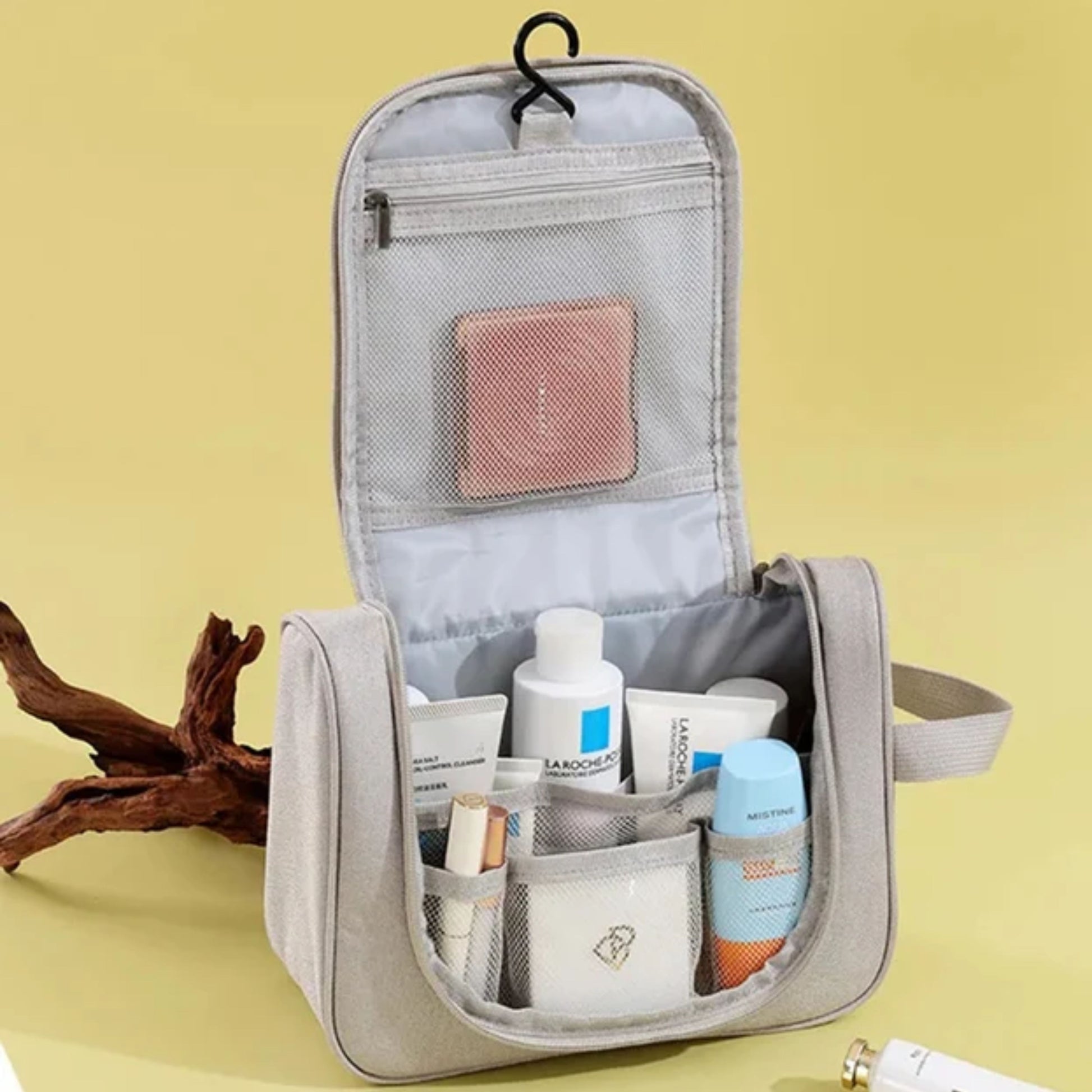 This elegant toiletry bag features a minimalist wabi-sabi inspired design with a soft matte polyester finish. It includes a built-in hook for easy hanging, making it perfect for both travel and home use. The spacious interior accommodates all your personal care essentials, while the durable material ensures long-lasting use.