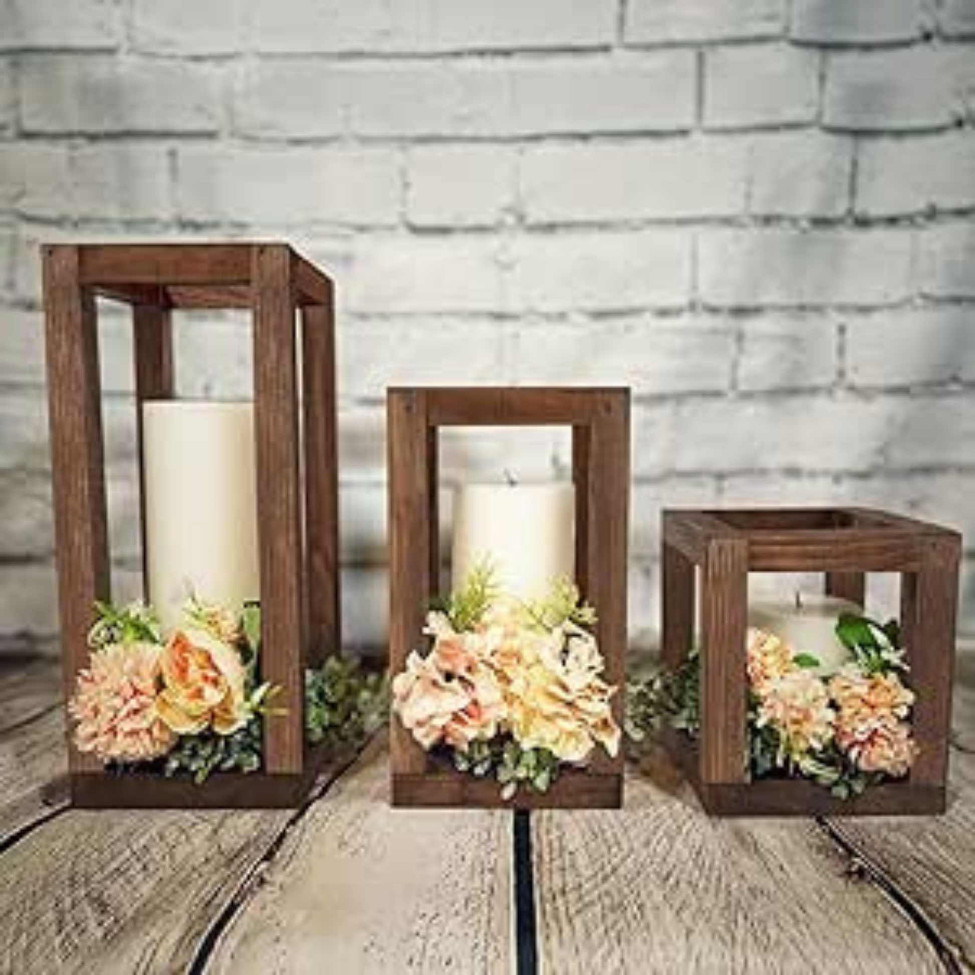 Enhance your indoor or outdoor ambiance with this charming set of three wooden candle lanterns. Each lantern is expertly crafted from natural wood and features a minimalist square frame that complements rustic, farmhouse, or boho decor. The graduated sizes make them perfect for creating layered lighting displays on tables, shelves, or event spaces. Ideal for candles or LED lights, they bring a soft, warm glow to any setting.