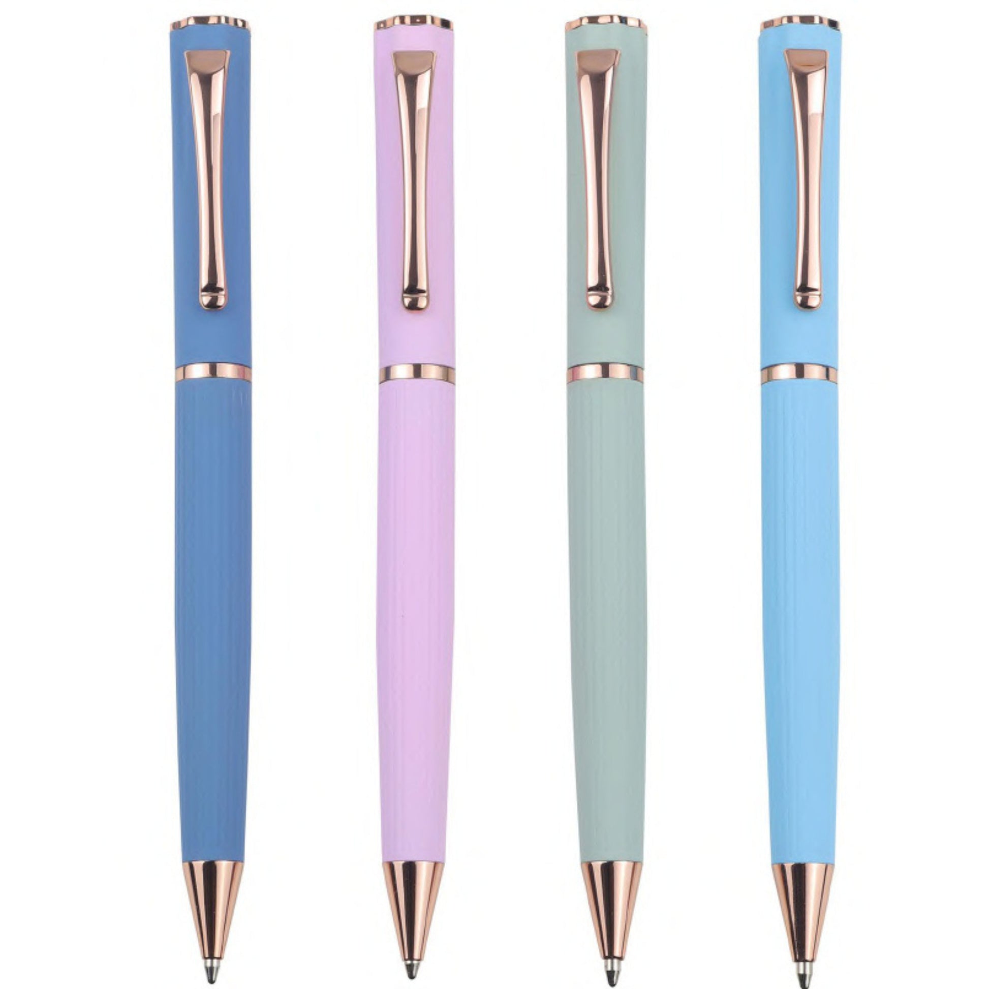 Metal body with custom color options, smooth 1.0mm ballpoint tip, black or blue ink refill, compatible with laser engraving or pad printing, click action or twist mechanism available on request.